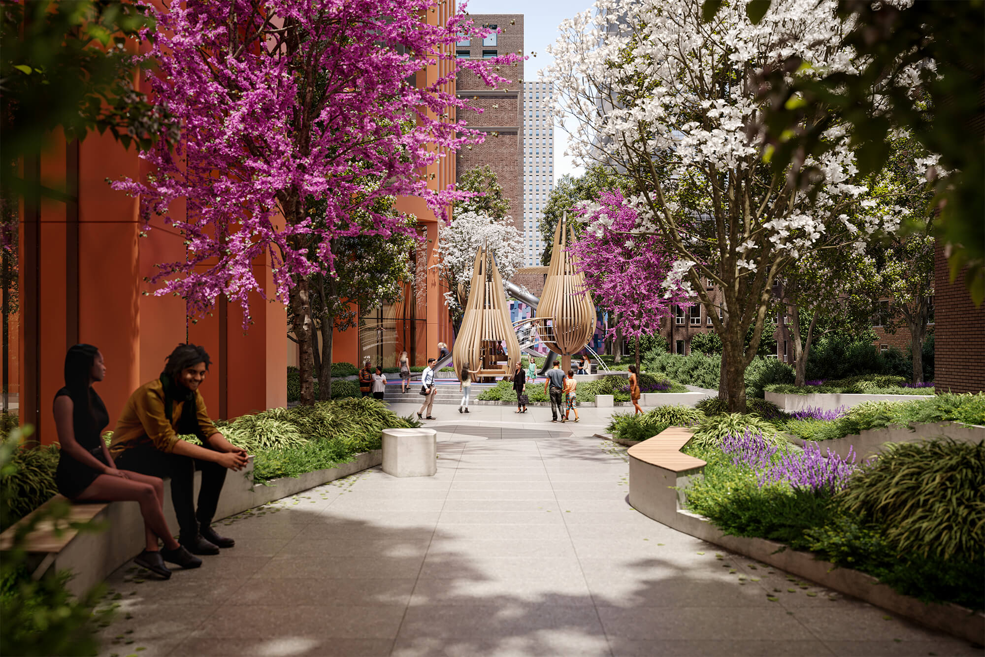 All units will be sited in proximity to a public amphitheater, an adventure playground, ample amounts of open space with cafes and patios, and significant retail amenities. The towers themselves are clad in red paneling contrasting with the other more recent towers built in the area, while also seemingly pulling from the brick masonry of others.