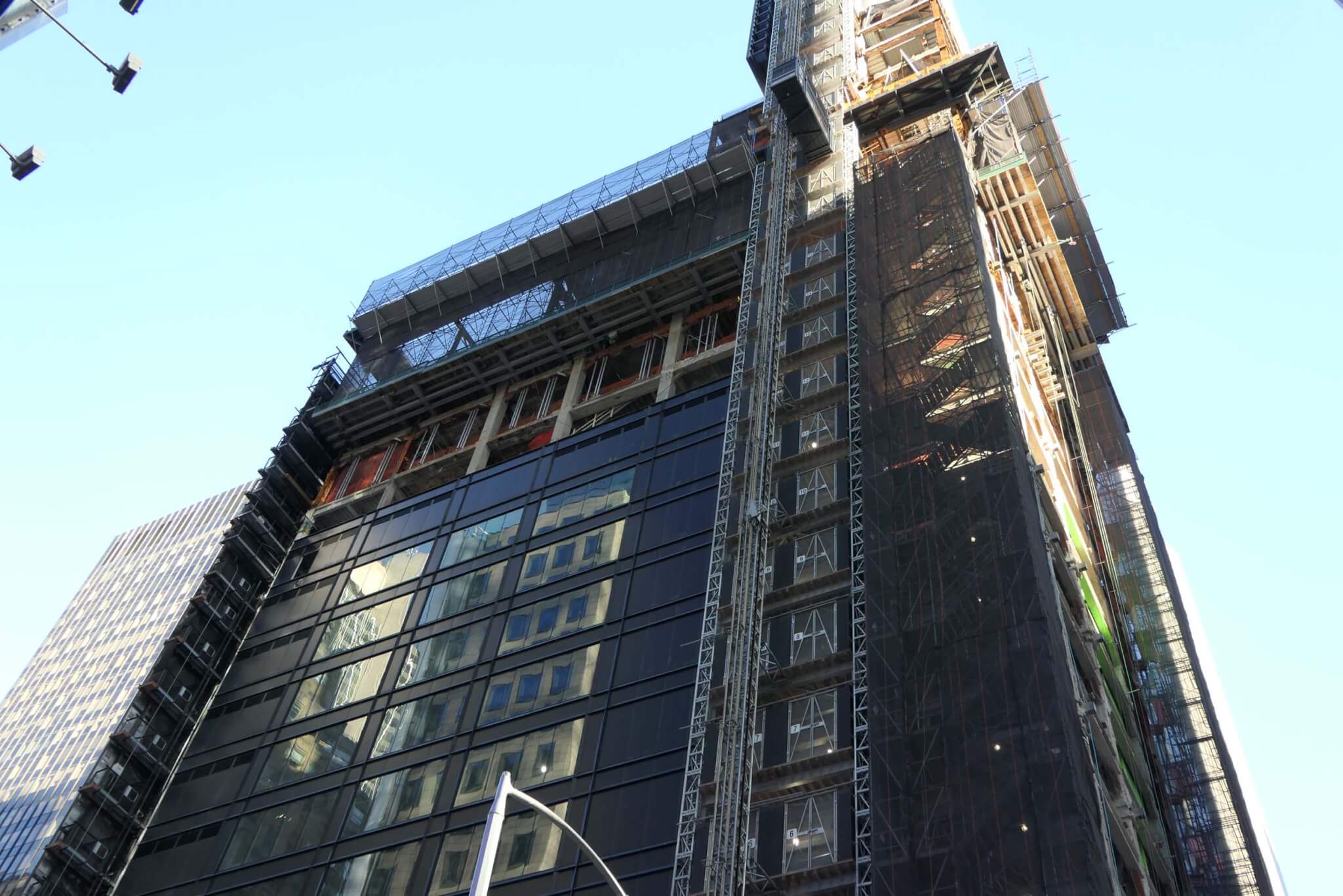 Curtain wall installation, managed by W&W Glass, has been complicated by the simultaneous construction of the truss for the observation platform. Because of this, the facade has been installed in piecemeal segments.