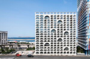 Pietri Architectes clads La Porte Bleue with a grid of concrete arches