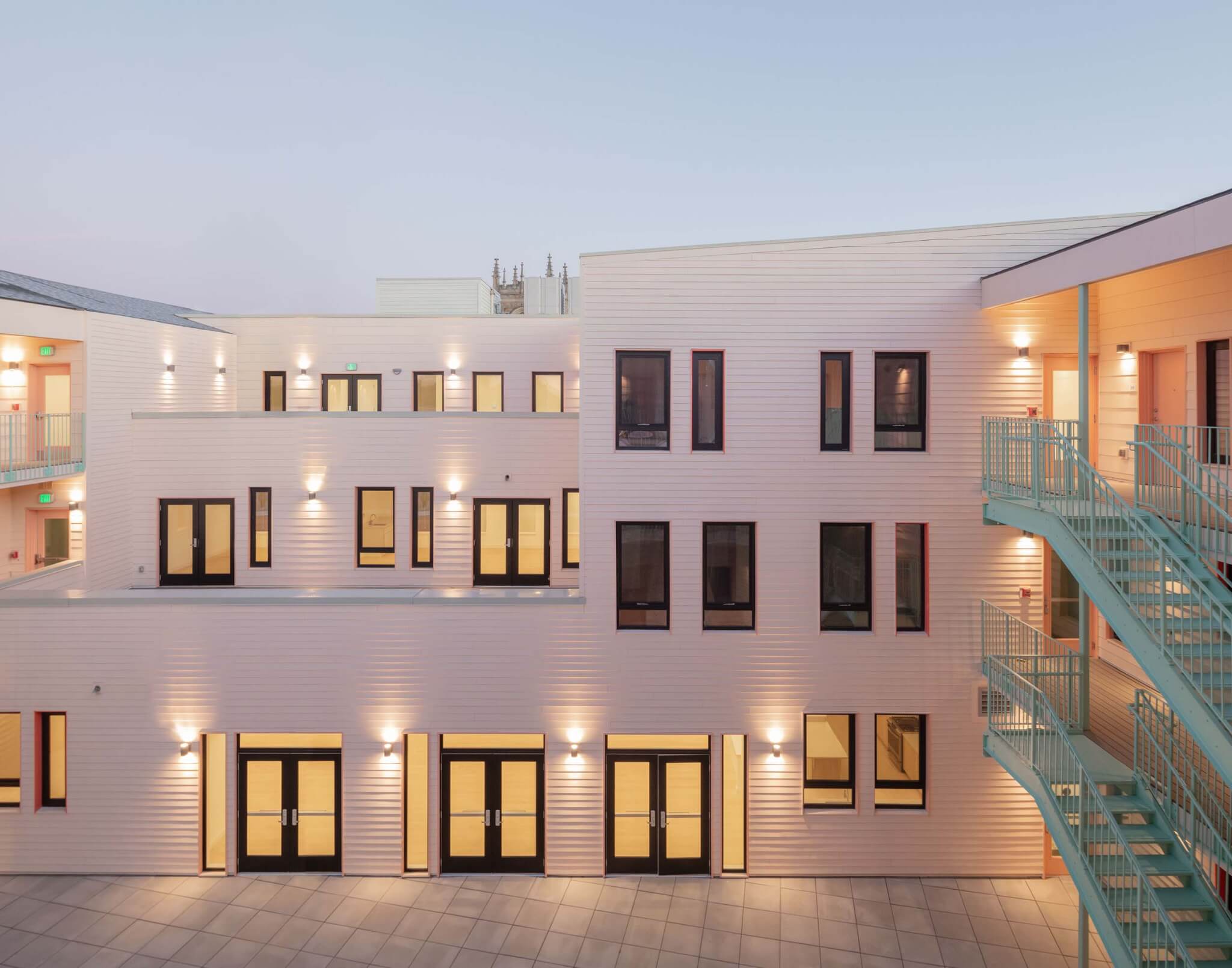 “We met with people in the neighborhood, and it just felt right,” said Lorraine Fryer, an early member of the group. Bay State Cohousing then tapped sister design duo, Jenny and Anda French of French 2D, to collaborate on a design prioritizing the group’s values: The 30-unit, 45,000-square-foot complex looks like a cross between an upscale Caribbean motel and something in New Orleans’s French Quarter. The color palette is lively: pastel greens and pinks and dashes of primary color here and there. The New Orleans–style central courtyard is an intentional gesture by the architects to give the building a sense of camaraderie and shared ownership.