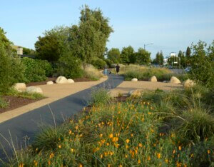 Surfacedesign recycles and repurposes objects and materials for a linear park alongside a busy roadway in Hayward, California
