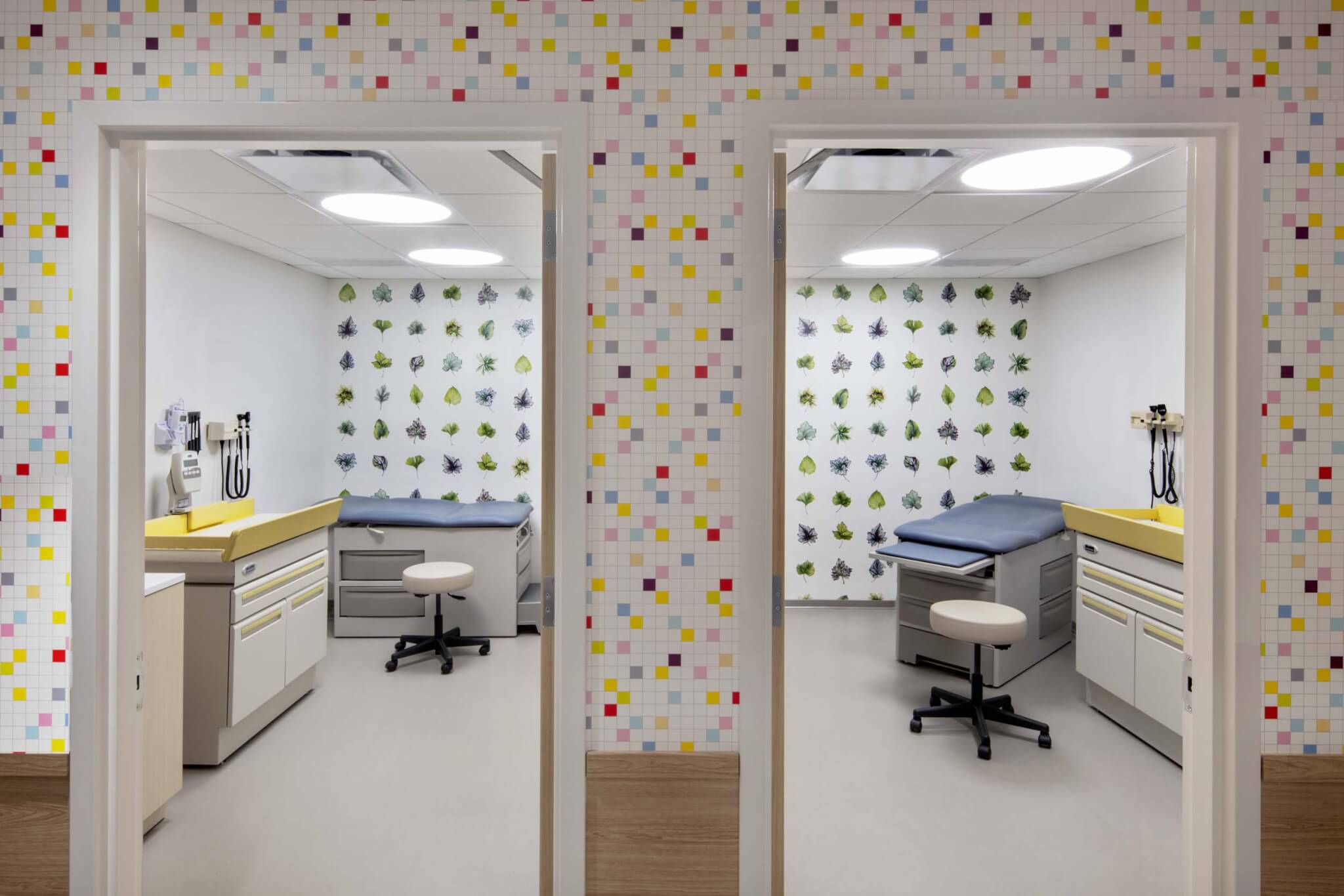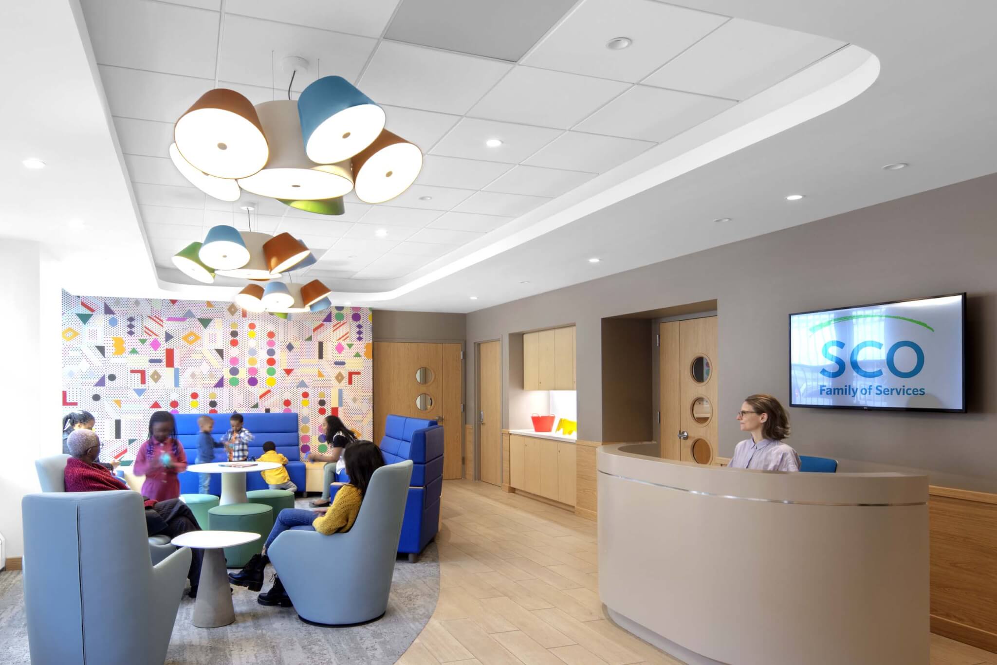 Our design for this center included a welcoming waiting area with soft upholstered furnishings to create a living-room feel and put guests at ease; medical exam rooms with bright, leaf-patterned wallpaper to calmly preoccupy patients; and mental health counseling rooms with dimmable light fixtures to allow families to have control over their environment. We also implemented two layers of security: one behind secure glass and another behind a curved desk in the open area to help SCO’s patients to feel assured of their protection in the friendliest way possible.