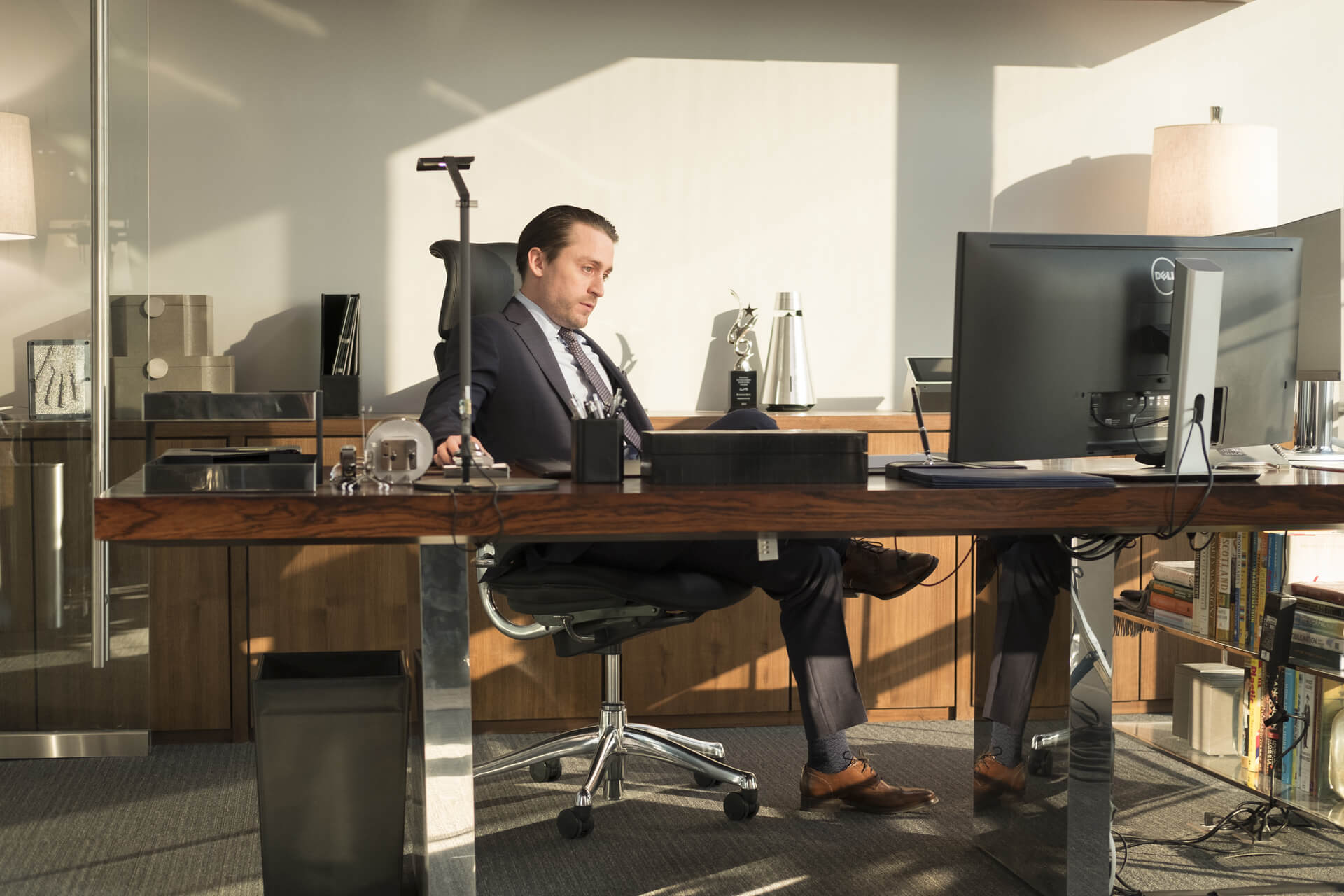 A more extreme and contemporary version of toxic work environments is on full display in HBO’s Succession. This story of the 1 percent of the 1 percent also folds in the absurdities of office culture as part of its generational struggle. The allure of fantastic wealth makes us all collectively curse when one Roy sibling is threatened with “flying commercial,” and paper shredding plays a central role in season 1’s plot. Success is displayed through influence, wit, and personal branding. The decentralized lives of the Roy family responds to a cultural desire for the executive life, with the freedom to conduct business anytime, anywhere—from a yacht, secluded mountain retreat, or Waystar Royco’s skyscraper HQ in Manhattan’s FiDi. In seasons 1 and 2, it was shot in two World Trade Center buildings (4 WTC by Fumihiko Maki and 7 WTC by SOM), while in season 3 they shift to 28 Liberty, designed by Gordon Bunshaft.