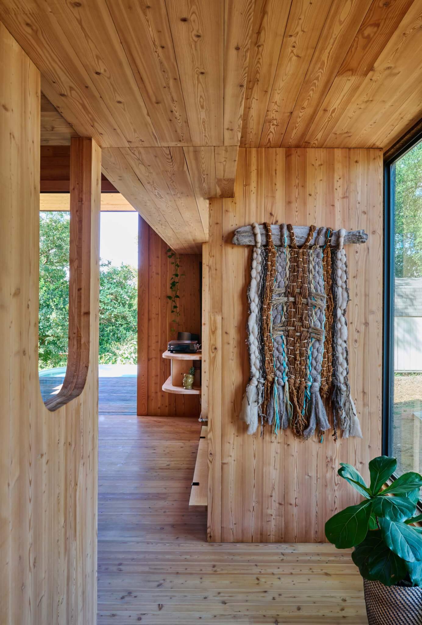 Business model aside, the house is also a rigorous investigation into mass timber panels. By setting various panel proportions perpendicular to each other, and thereby generating short cantilevers, and by accounting for the use of all cut pieces, Esparza has been able to generate remarkably rich layering, especially in the making of surprisingly deep, glass-enclosed window seats and startling sectional slots of space. Yet the house is directly and straightforwardly detailed, allowing the basic steps in its fairly simple carpentry to remain evident.