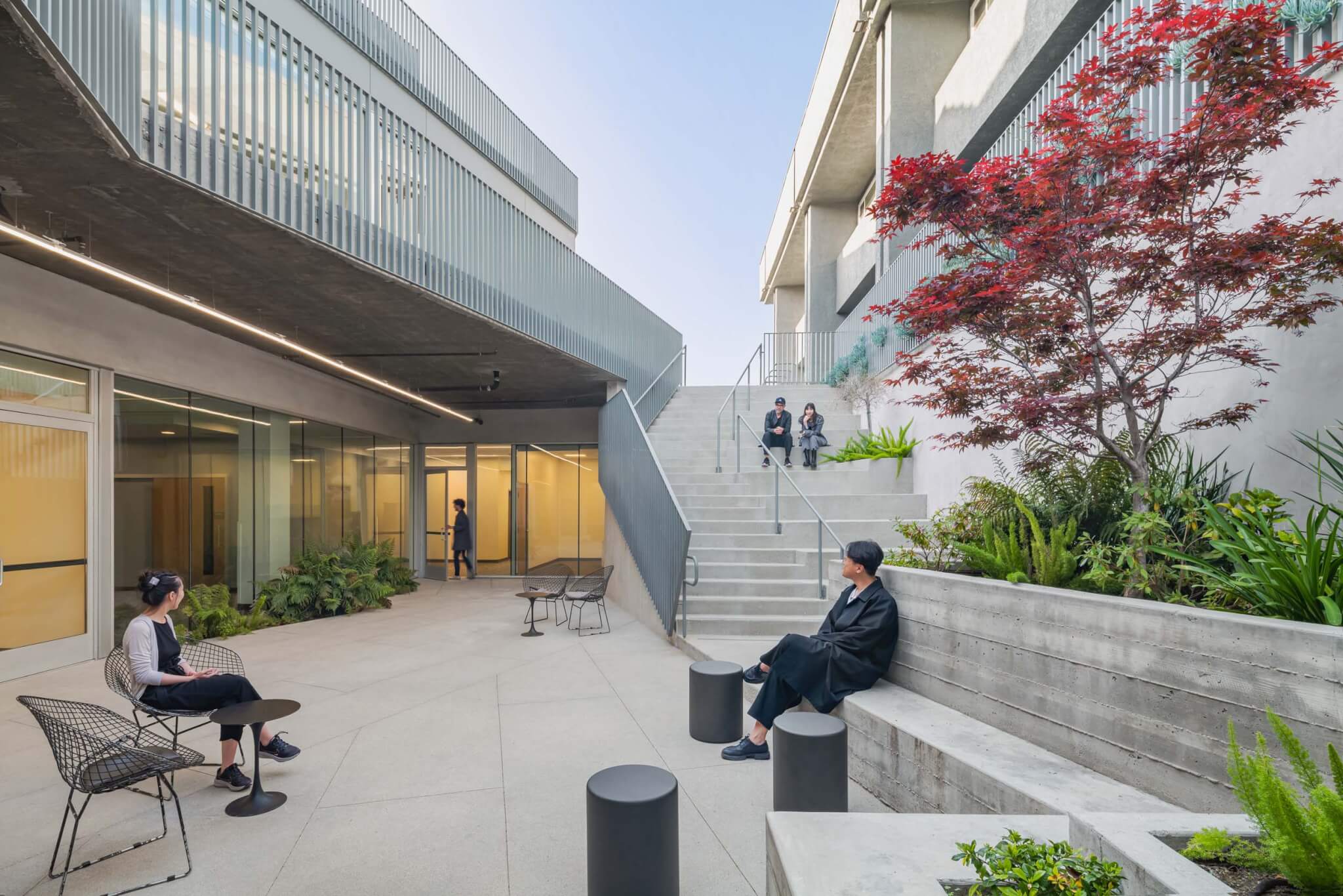 “In terms of climate and sustainability, the best thing you can do with a building is keep it,” Spina explained. Indeed, the retrofit is strategic in its moves and use of resources. The architects did little more than freshen up the existing office building with a new paint job in shades of gray, focusing their attention instead on adaptive reuse of the older building and a new 10,000-square-foot courtyard. That green space is a kind of front door for the campus. Populated with trees, planters, and places to sit, it not only connects the two structures but also visually links Victory Boulevard to the parking lot behind, where most visitors arrive.
