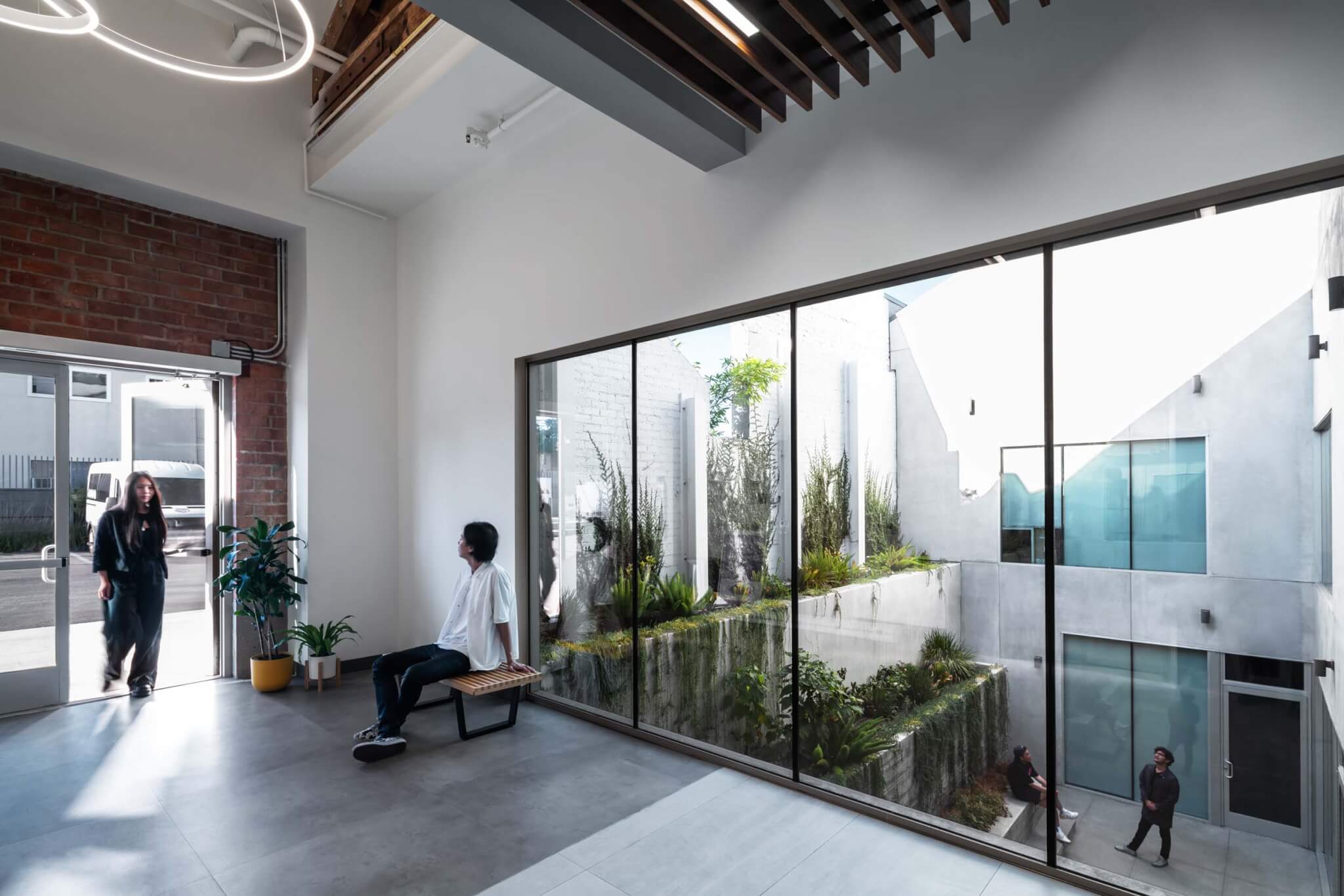 Along the eastern facade, a concrete stair leads to a lower-level lobby, cutting a triangular whorl out of the ground-level plaza. Terraced and lushly planted with ferns and succulents, it suggests a mini canyon or grotto. To the north, another courtyard is a long rectangle, enclosed on one side by the existing brick facade dripping in hanging vines so that patients might look out at the greenery.